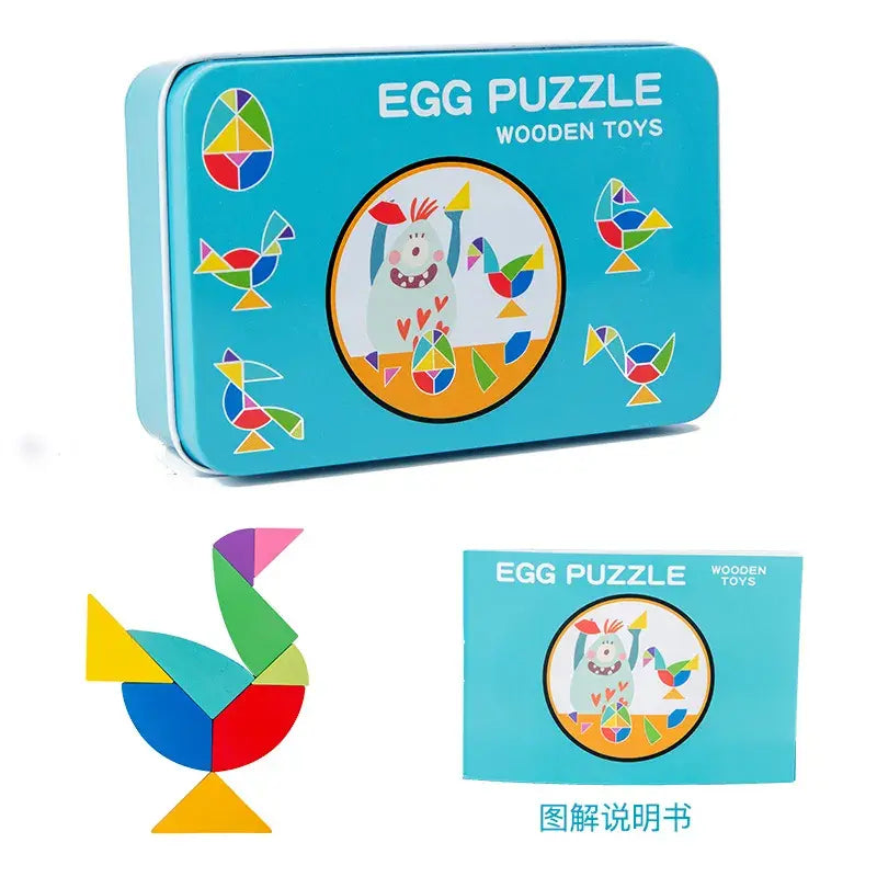Contents: 1 wooden tangram puzzle, plastic storage box